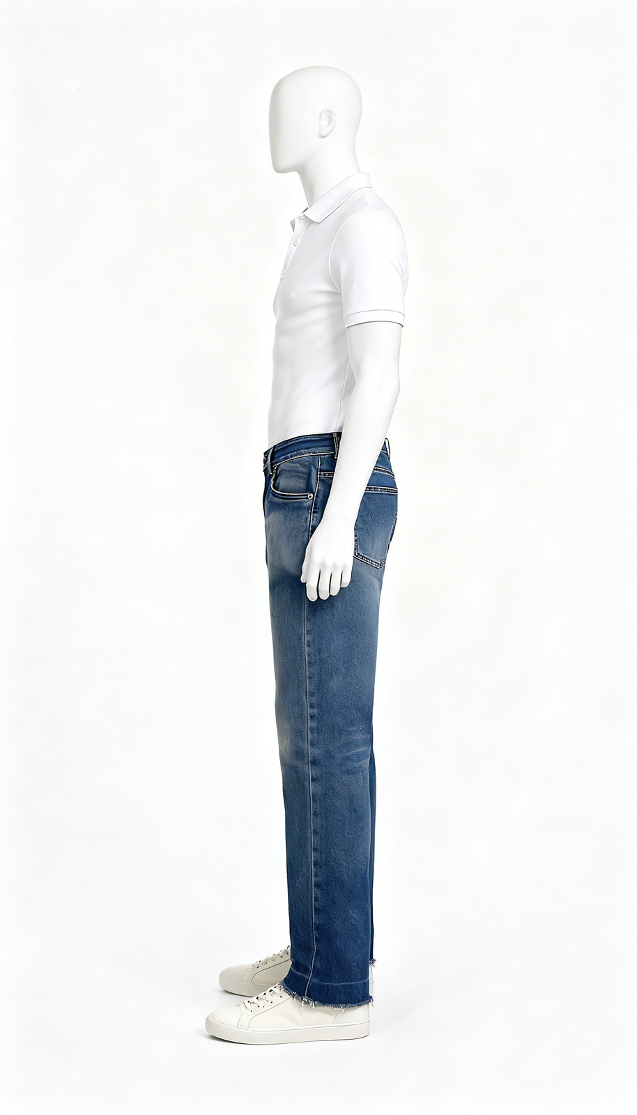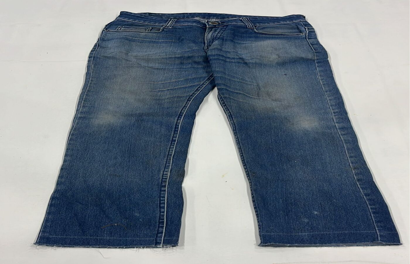 Blue straight-cut washed jeans with worn fade detailing and raw-cut hem for a rugged casual look. Comfortable and durable for daily wear.
