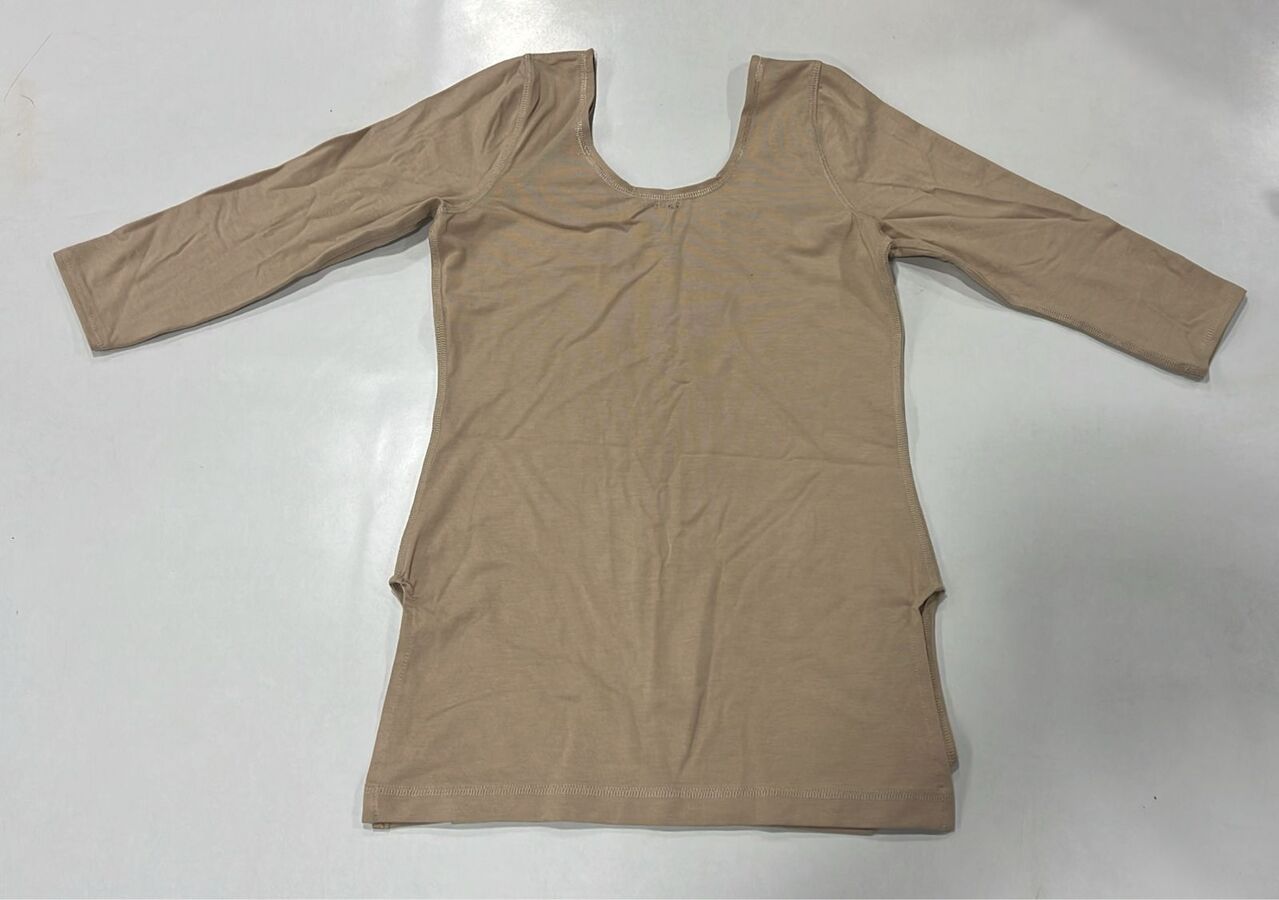 A solid beige long-sleeve fitted top designed with a U-neckline, slim silhouette and straight hemline suitable for everyday wear