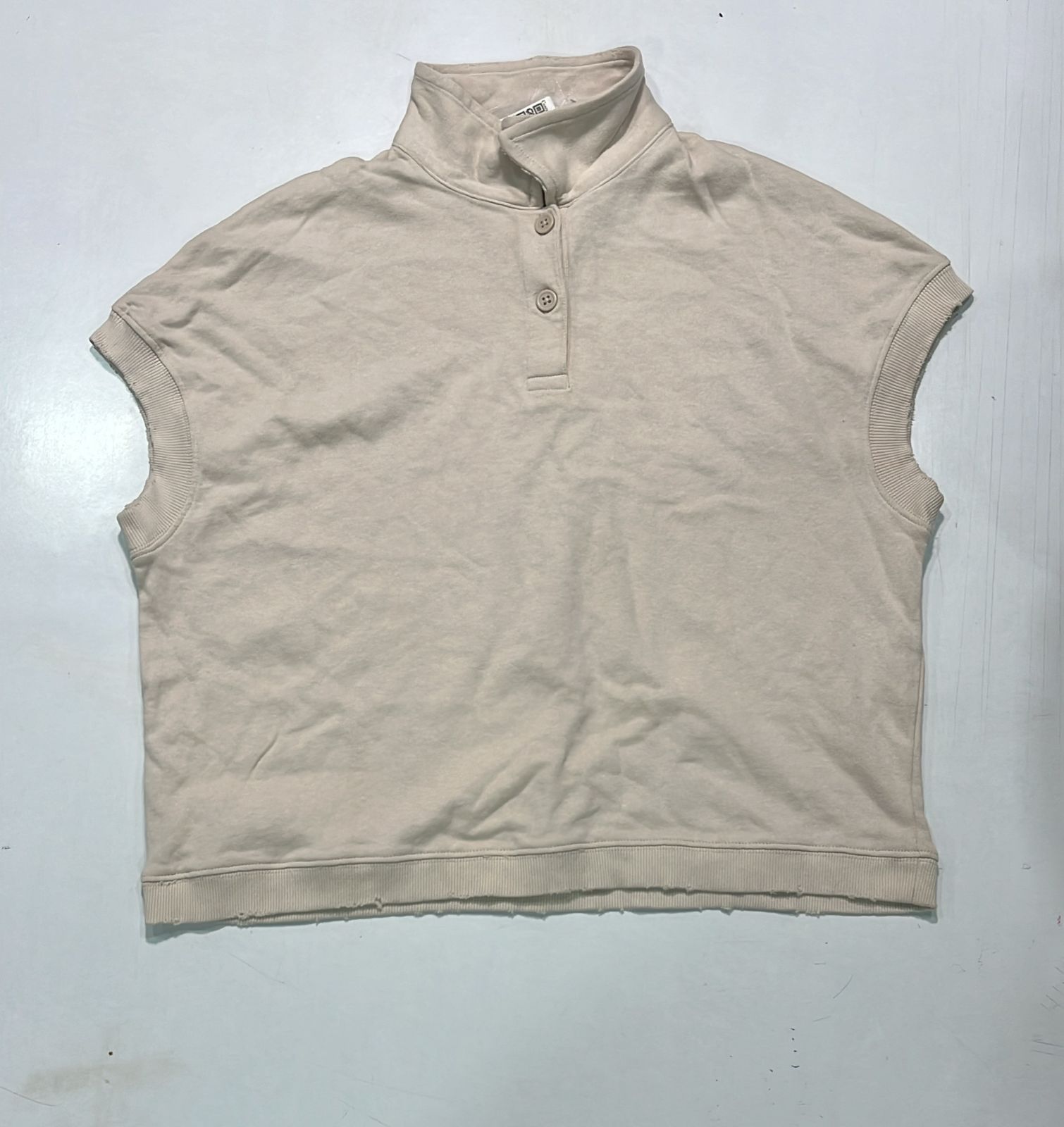 A minimal and stylish sleeveless polo collar top in a soft beige hue, perfect for casual and semi-casual outings. Crafted from breathable cotton blend fabric, it features a structured ribbed hem, three-button placket, and a classic flat collar. The sleeveless cut ensures comfort and ease of movement, making it a great staple for warm-weather layering or standalone wear.