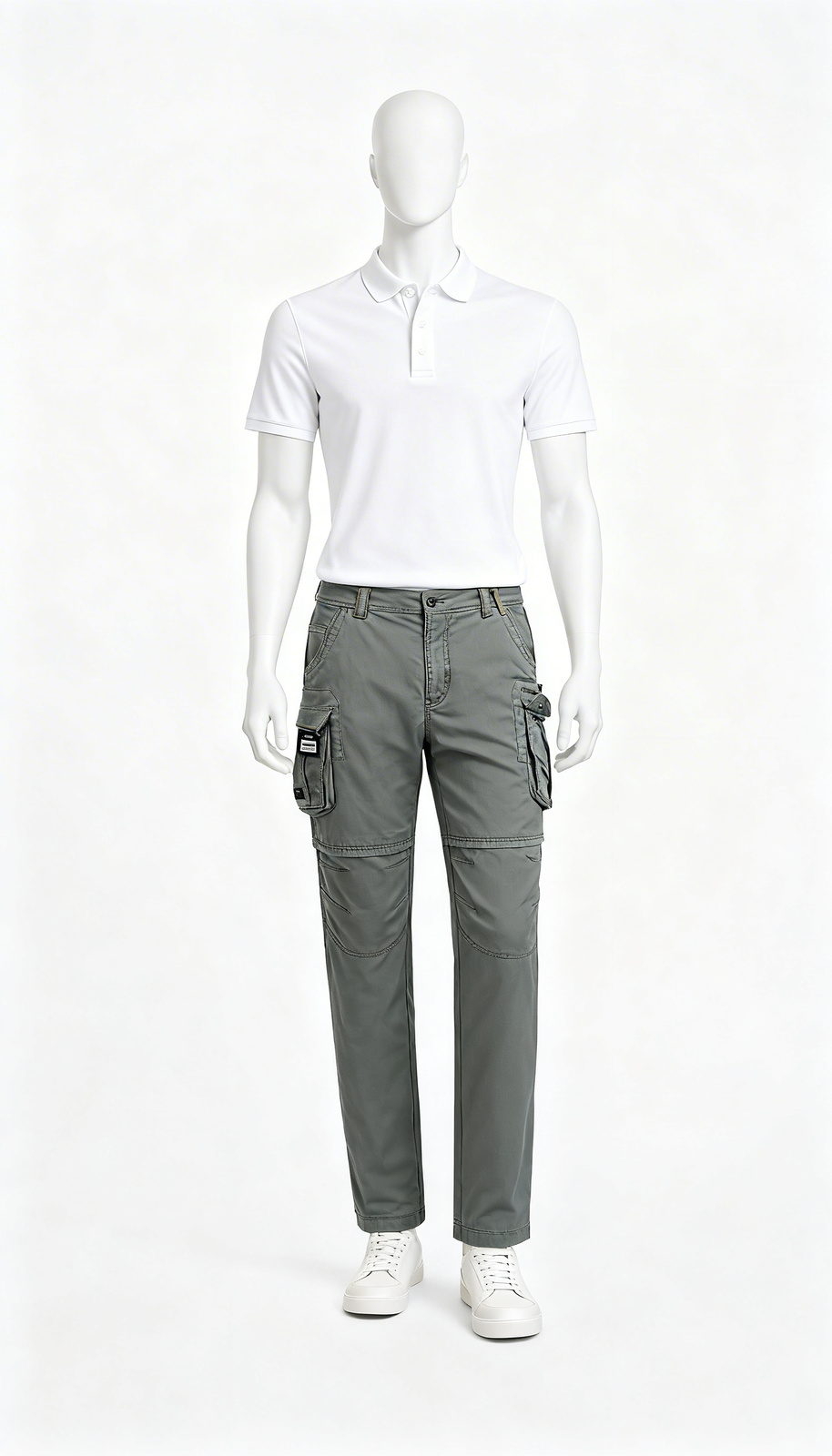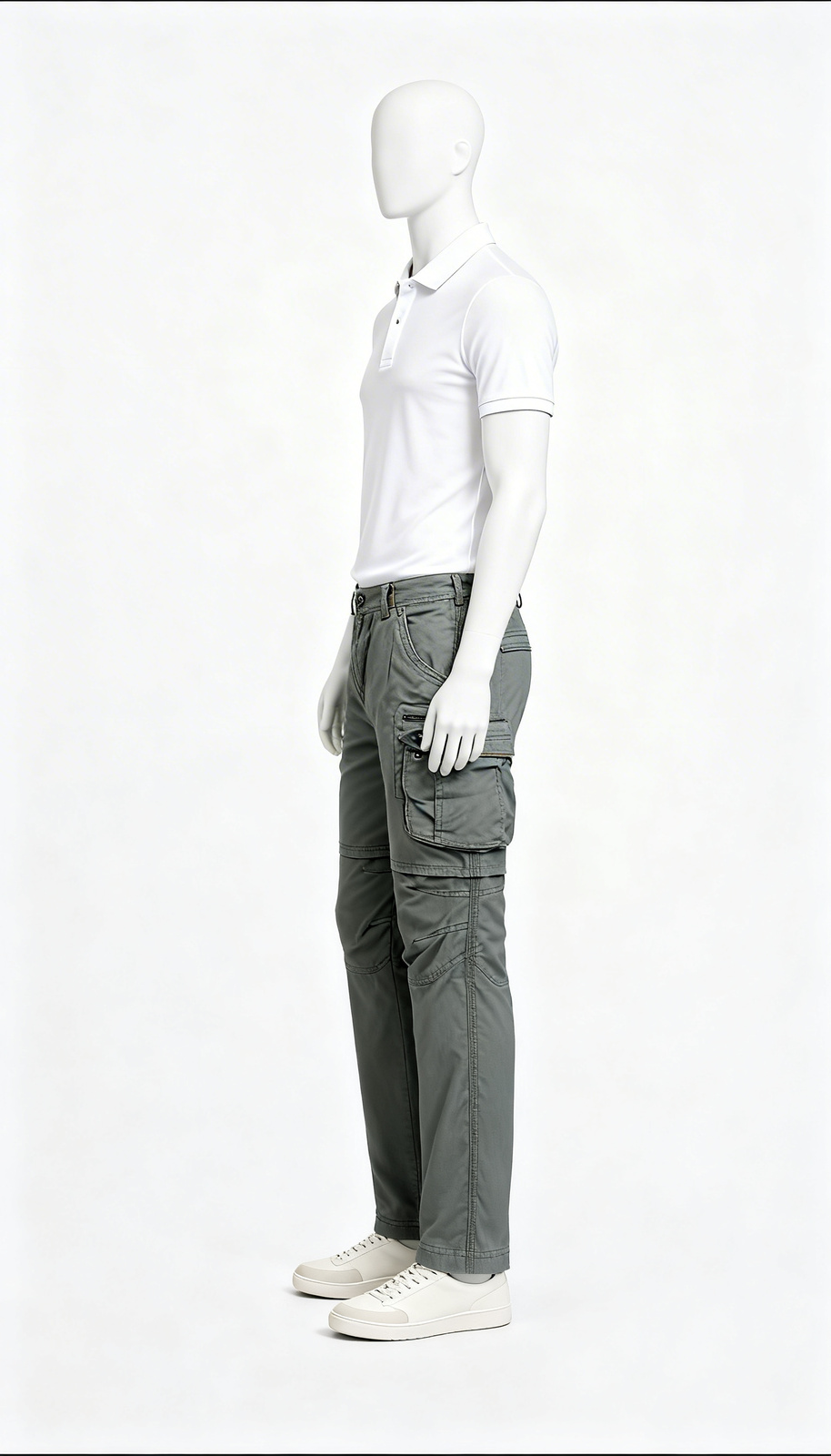 Stylish grey cargo pants with multiple utility pockets, relaxed fit and durable fabric. Perfect for outdoor activity and casual wear.