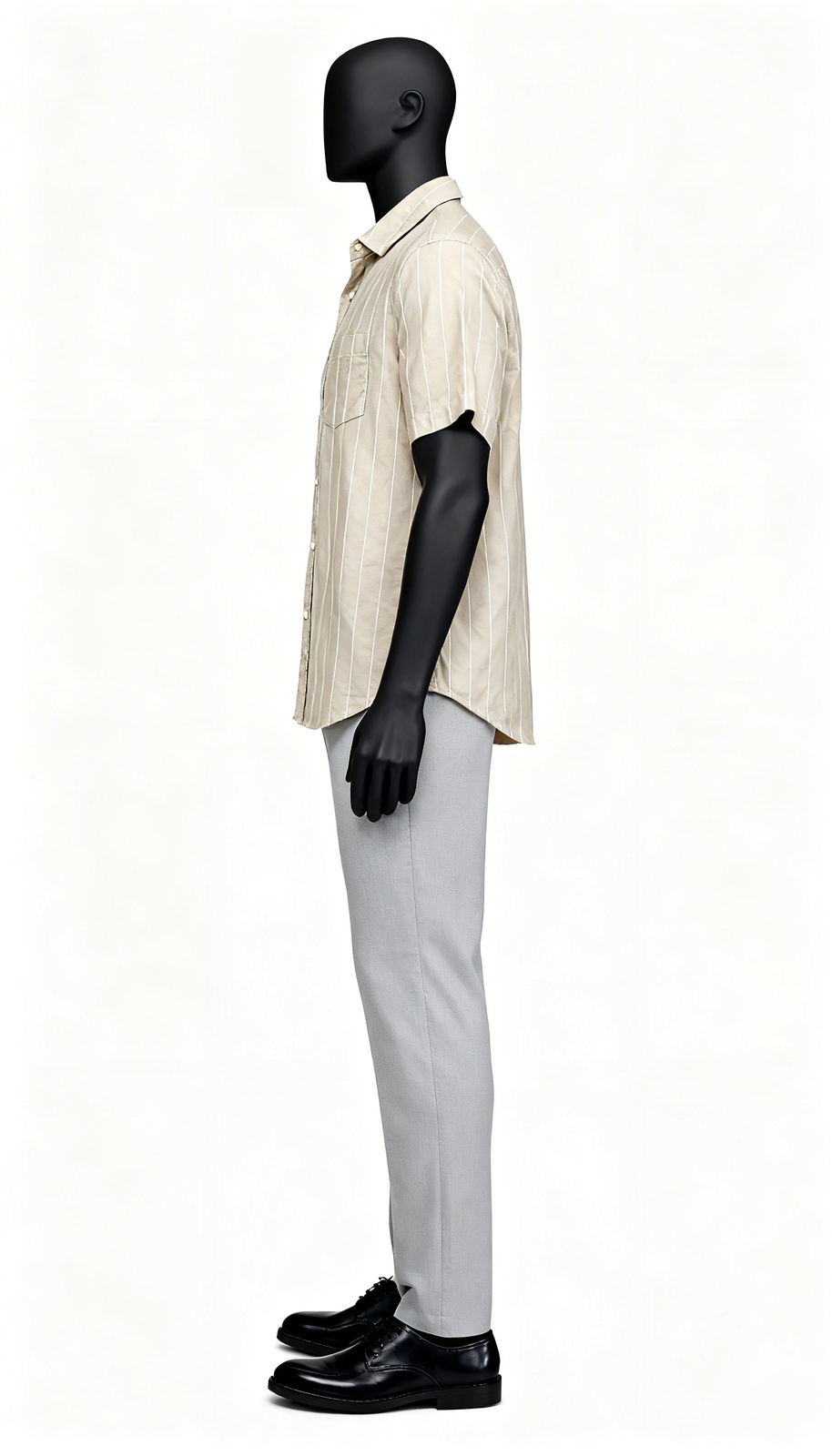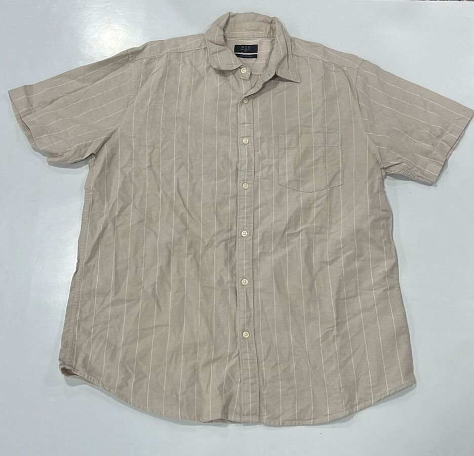 A beige vertical stripe short sleeve shirt crafted in breathable cotton blend offering lightweight comfort. The subtle stripes add a neat casual office style, ideal for warm days, daily work and relaxed smart-casual wear.