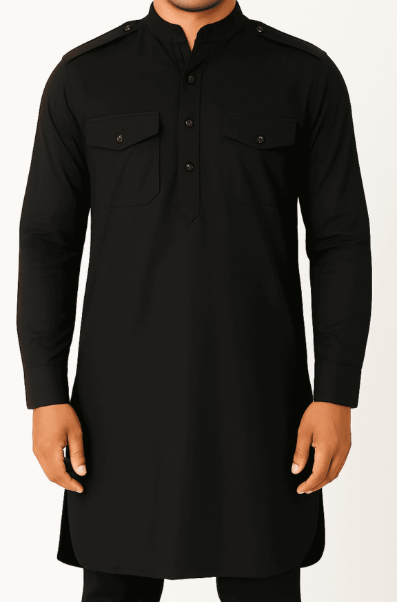 Black Military-Style Kurta Shirt for Men, A black kurta shirt with epaulettes, buttoned chest pockets, and mandarin collar – perfect for a modern ethnic look.