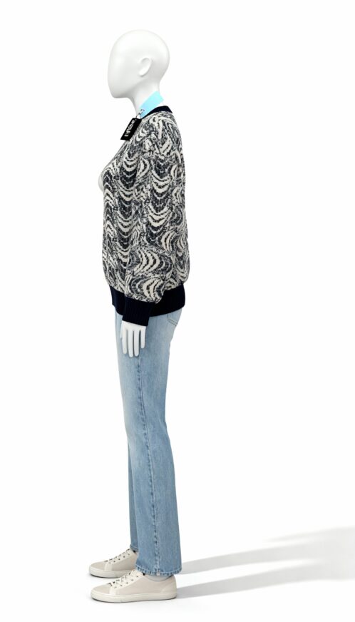 A cozy winter sweater featuring a bold wavy knit pattern in black and off-white, designed with a crew neckline and ribbed trims for a neat finish.