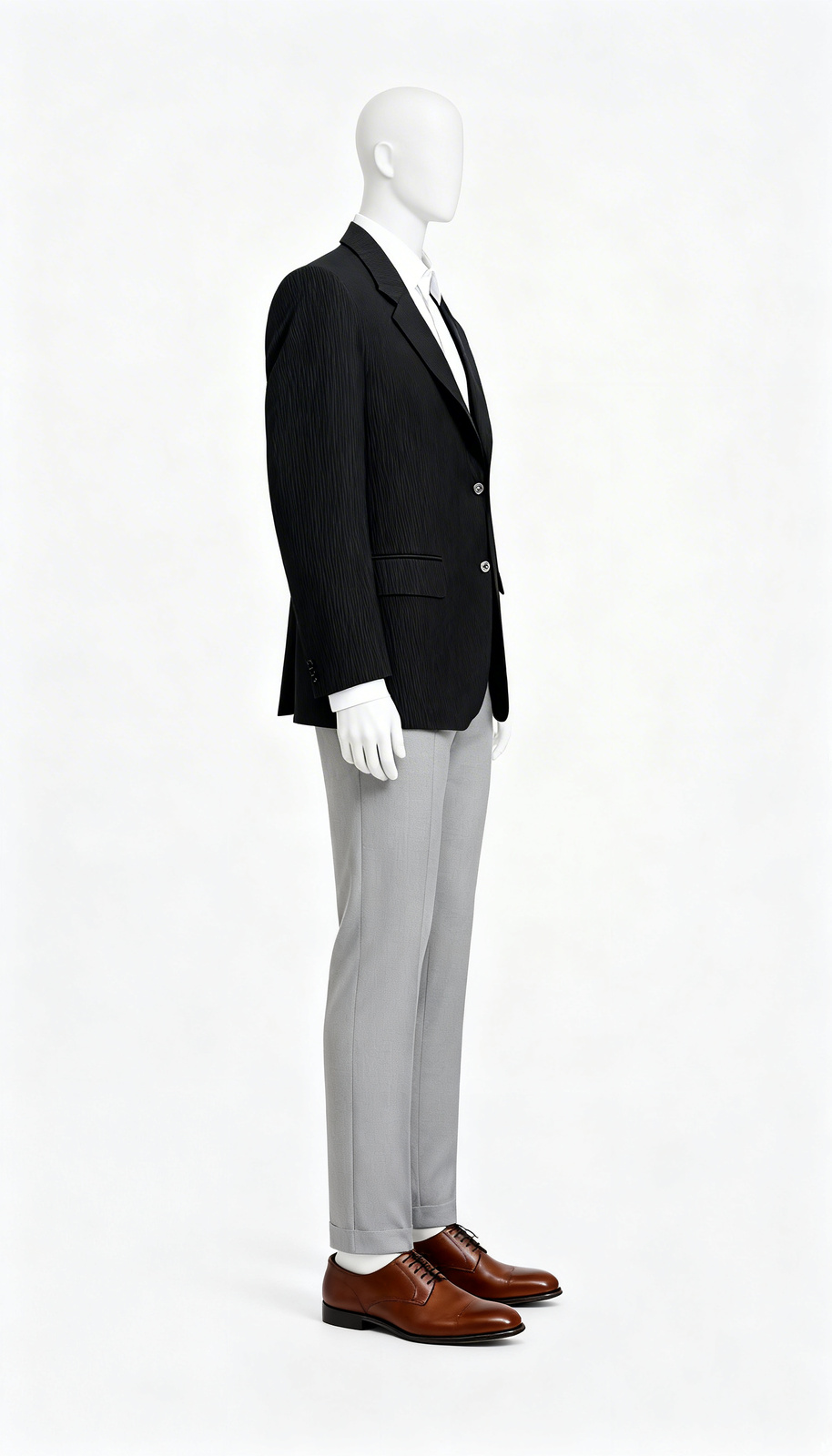 Classic black pinstripe blazer with structured shoulders, two-button closure, and sleek tailored design for formal events.