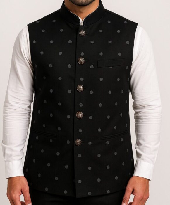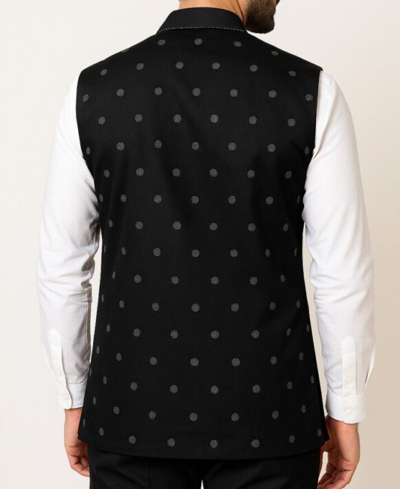 Add timeless elegance to your ethnic or formal wear with this classic black Nehru jacket for men. Featuring subtle embroidered polka dots and royal-style metallic buttons, this sleeveless jacket offers the perfect blend of traditional charm and modern flair. It includes a Mandarin collar with piped detailing, functional welt pockets, and a structured silhouette tailored for refined occasions. Wear it over a kurta or formal shirt to elevate your festive, wedding, or evening ensemble.