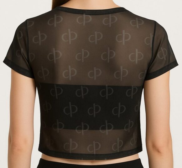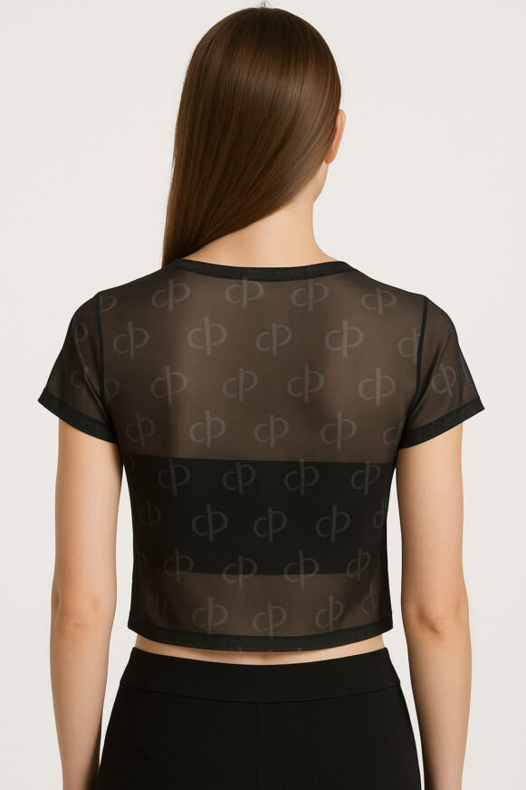 Black Sheer Logo Mesh Crop Top Elevate your style with this sleek black sheer mesh crop top, featuring an all-over tonal "cp" logo print for a bold yet minimalist look. Designed with a classic crew neckline and short sleeves, this fitted crop top blends transparency and structure through its contrast opaque panel across the bust and back, providing coverage while maintaining its edgy appeal. Perfect for layering or wearing solo, this top is ideal for casual outings, night looks, or statement streetwear. Crafted from a lightweight, breathable mesh fabric, it offers both comfort and contemporary flair.