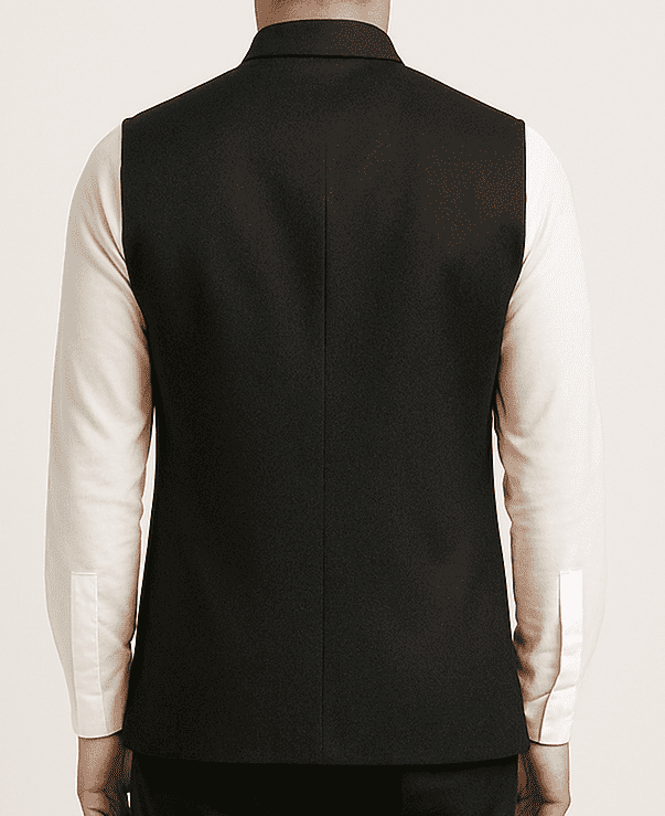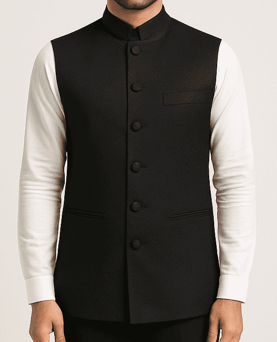 Black Solid Mandarin Collar Nehru Jacket, Classic black sleeveless Bandhgala jacket with white full sleeves, Mandarin collar, and three functional pockets – a perfect blend of tradition and elegance.