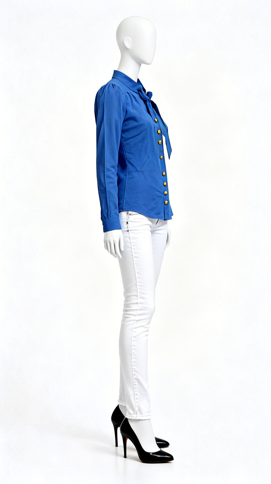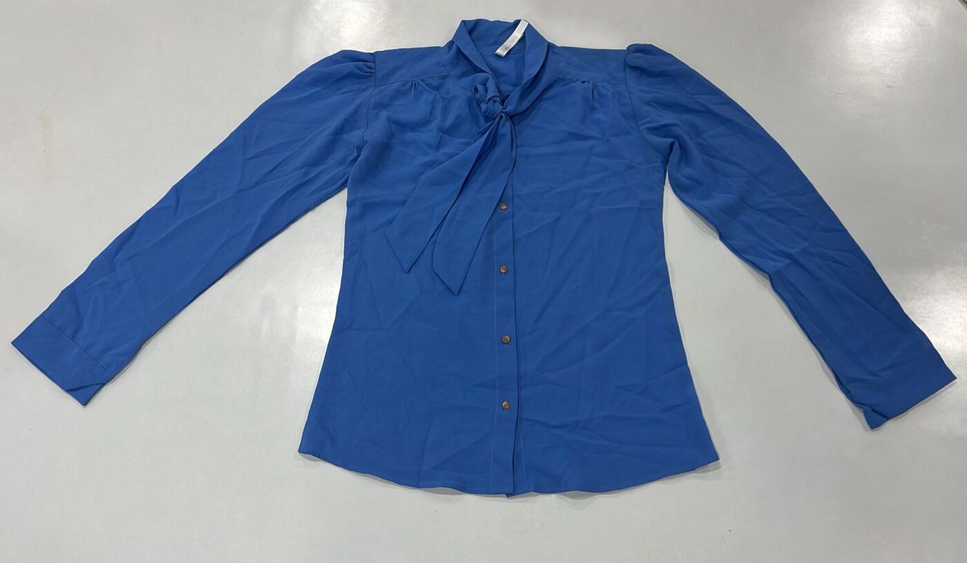 A solid blue shirt featuring a bow-tie neckline, long sleeves, button closure and a sleek straight hemline ideal for office wear