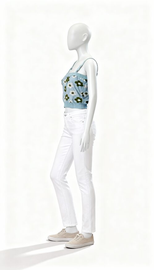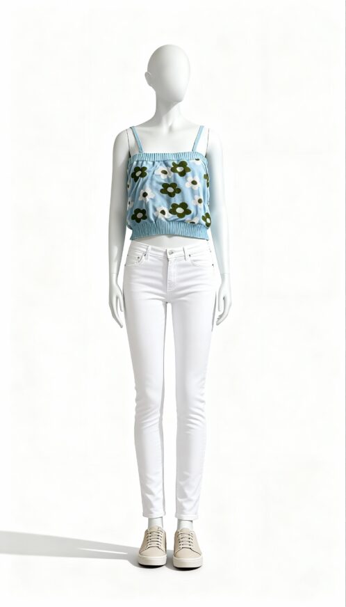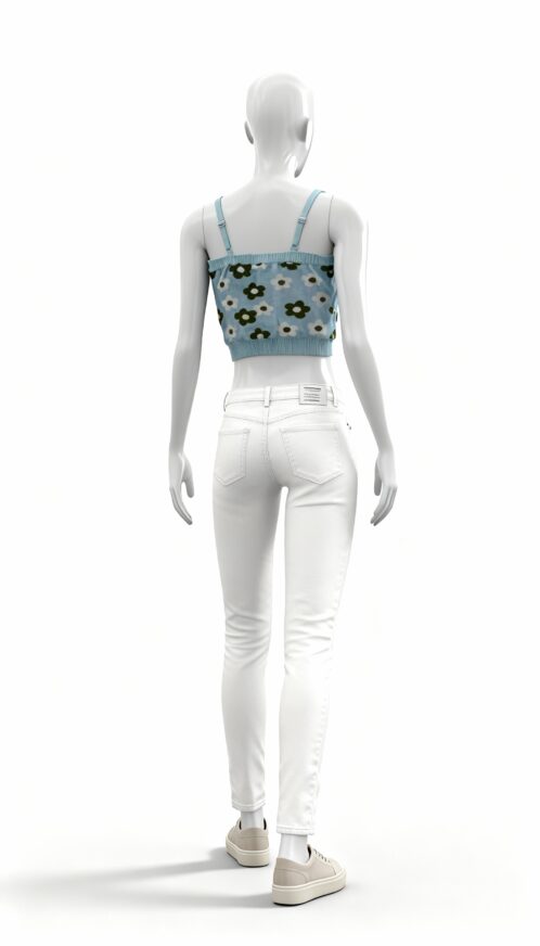 A blue knitted sleeveless top featuring a floral pattern and ribbed edges.