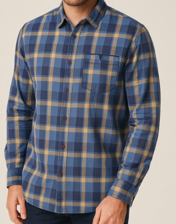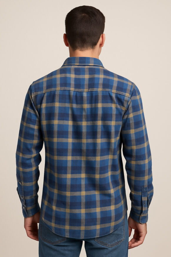 This men's full-sleeve casual shirt features a classic checkered pattern in deep blue, mustard yellow, and charcoal grey tones. Crafted from soft and breathable cotton, it offers all-day comfort and effortless style. The shirt has a standard spread collar, a front button placket with maroon buttons, and a single chest pocket with a distinct cut-out detail. Its slightly curved hemline and tailored fit make it perfect for both casual and semi-formal occasions.