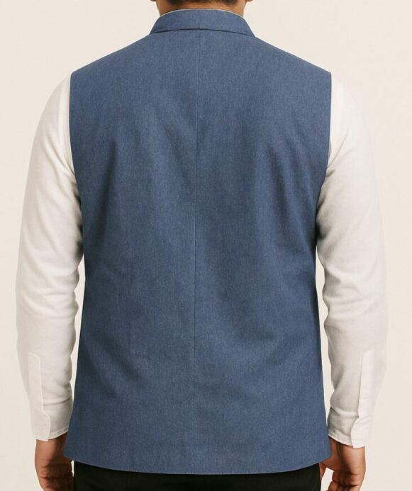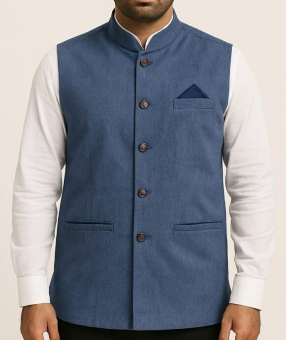 Blue Nehru Jacket, A timeless blue Nehru jacket with a mandarin collar and classic welt pockets, perfect for weddings, festivals, or layering over shirts and kurtas.