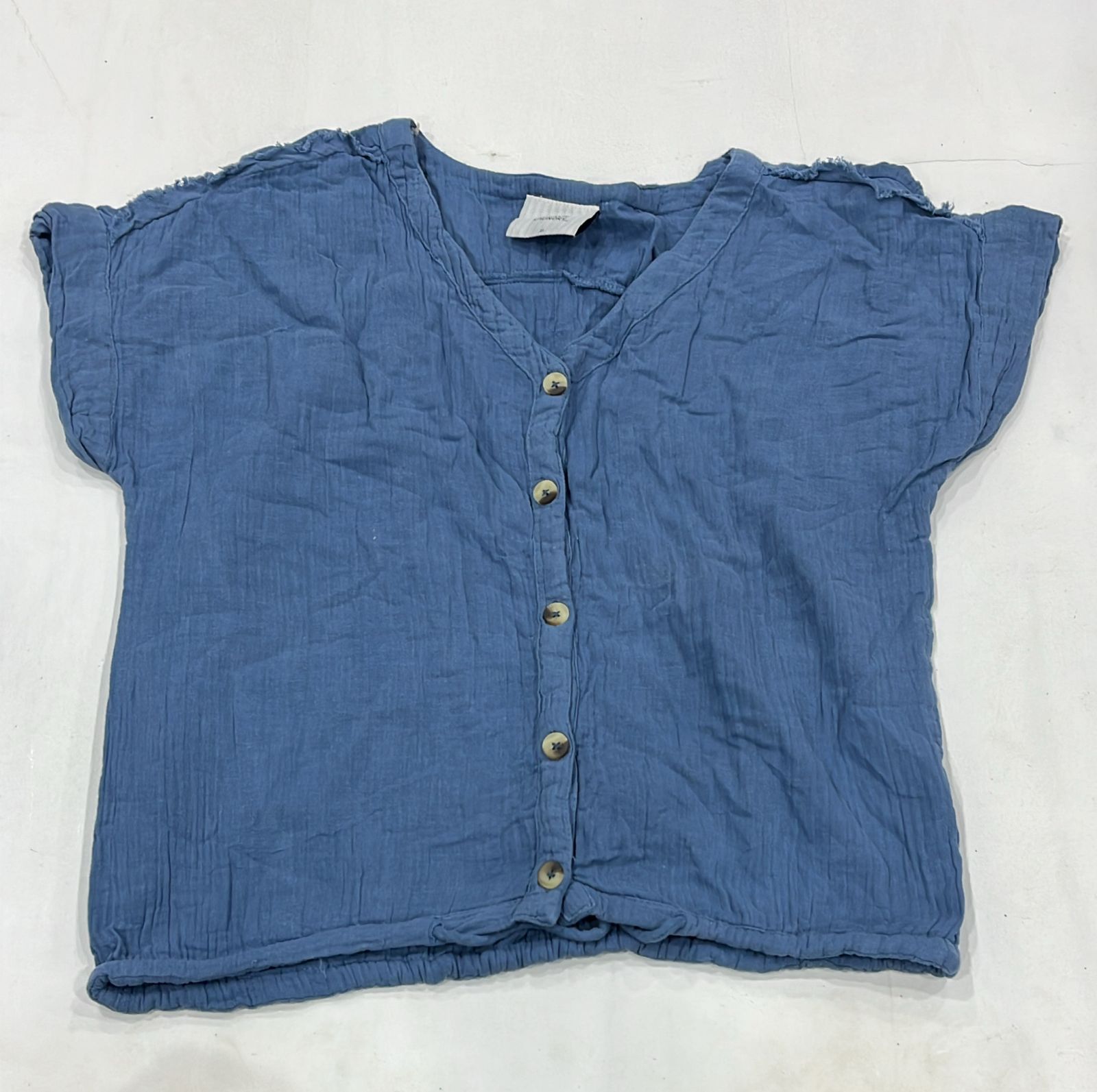 Short sleeve solid crop top with front button closure and relaxed everyday structure