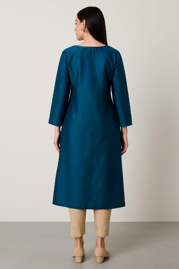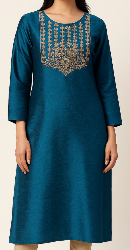 Blue Straight Kurta, Elevate your ethnic wardrobe with this elegant teal blue straight kurta, crafted in a rich fabric with a subtle sheen. Featuring full sleeves and a modest round neckline, the highlight of this kurta is the exquisite golden thread embroidery on the front yoke, creating a regal and intricate design. Paired with beige pants, it offers a graceful silhouette that falls below the knees. The back is plain, enhancing the refined aesthetic. Ideal for festive occasions, office wear, or semi-formal gatherings.