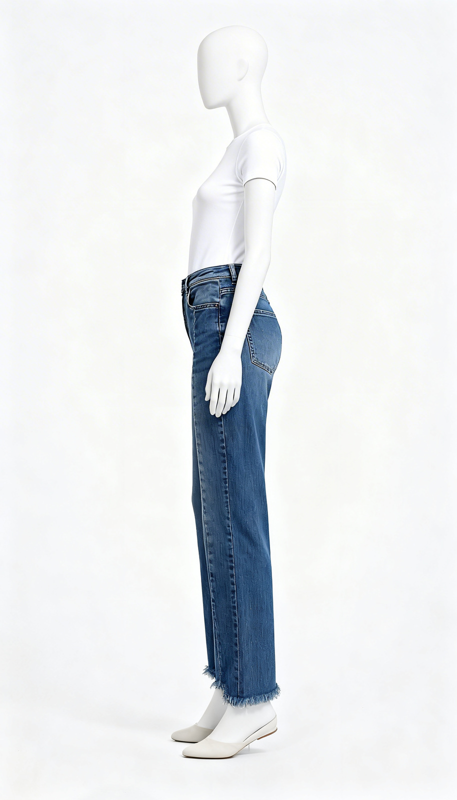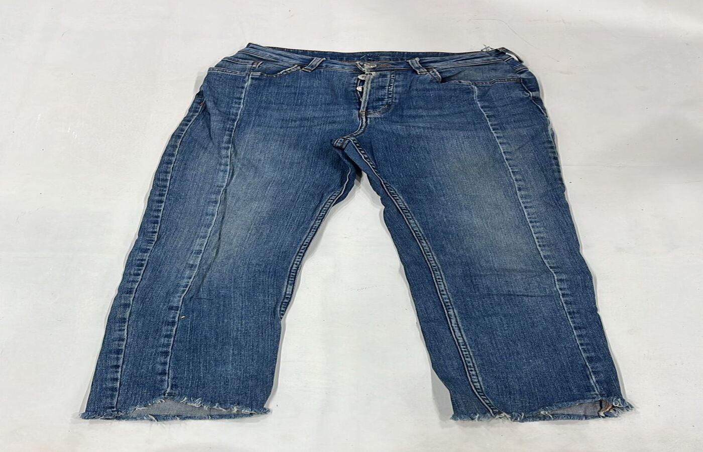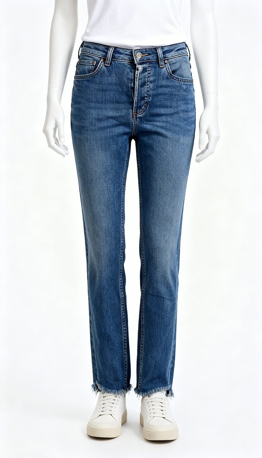 A blue washed straight fit jeans featuring raw frayed hems and a relaxed everyday silhouette.