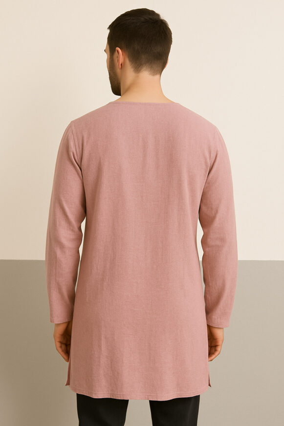 Blush Textured Cotton Kurta, A contemporary take on ethnic wear, this men's kurta comes in a soft blush rose hue, crafted from breathable textured cotton fabric. The kurta features a simple round neckline with a short V-notch, leading to a minimal placket with two wooden-look buttons. It has full-length sleeves and a clean silhouette with a straight hemline and small side slits for comfort and ease of movement. Ideal for casual outings, festive occasions, or paired with denims for a modern fusion look.