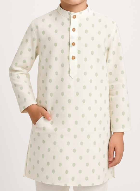 Dress your little one in timeless elegance with this ivory kurta featuring subtle green buti prints all over. Made from soft and breathable fabric, it offers all-day comfort while maintaining a sharp traditional look. Designed with a mandarin collar and wooden-look buttons, this kurta is perfect for festive occasions, weddings, and family gatherings. The straight cut and full sleeves add a neat and graceful appearance. Pair it with white trousers or pajamas for a classic ethnic ensemble.
