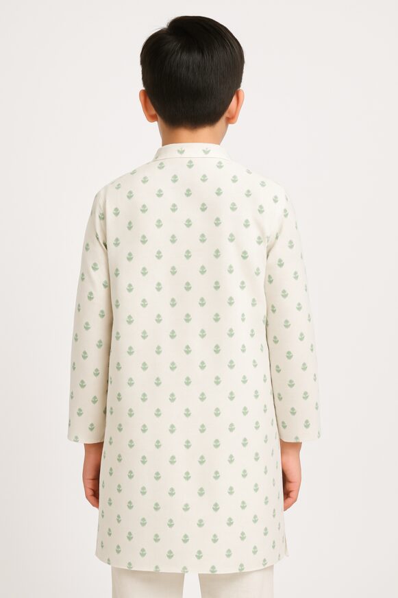 Boys Ivory Green Kurta, Elegant ivory green printed kurta with mandarin collar and wooden-look buttons for boys.