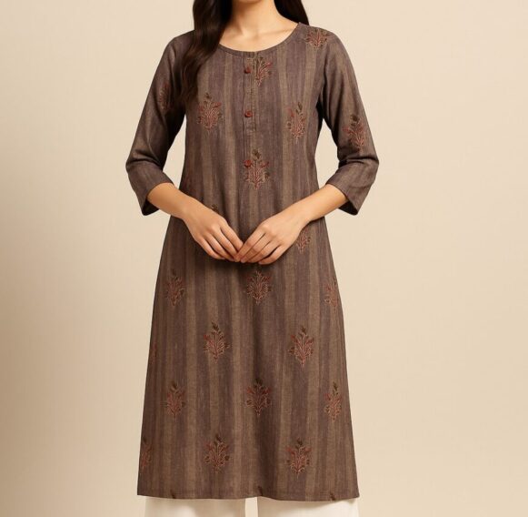 This elegant brown cotton kurta set features subtle vertical woven stripes and all-over floral embroidery in earthy rust and olive tones. The straight-cut kurta comes with a round neckline, front wooden buttons, and 3/4th sleeves, lending a timeless ethnic appeal. The embroidery motifs are thoughtfully spaced across the front, sleeves, and back. It is paired with off-white wide-leg palazzo pants for a chic and comfortable look, perfect for casual or semi-formal occasions.