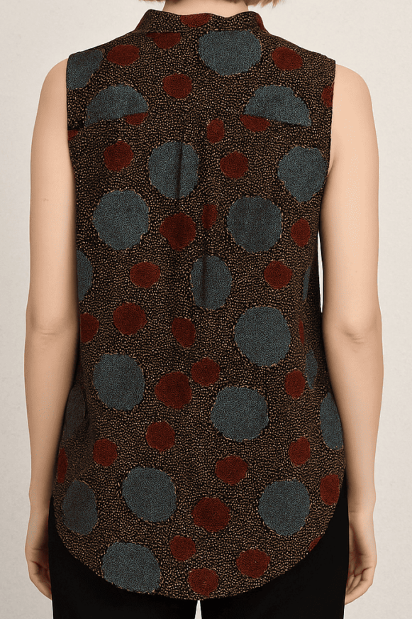 Sleeveless brown shirt with button-down front and artistic blue-maroon polka dot print.
