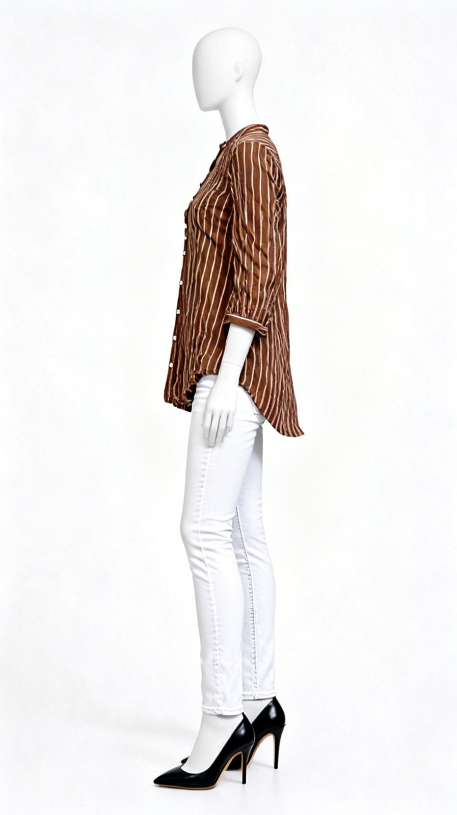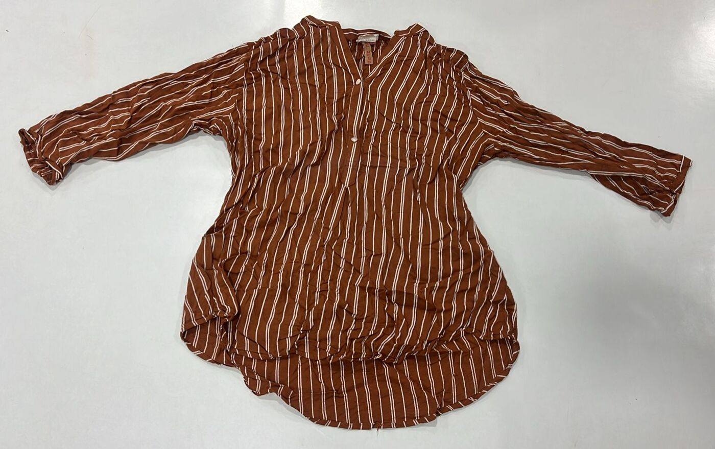 A brown striped shirt featuring long sleeves, a relaxed silhouette, a round neckline and button detail ideal for casual wear