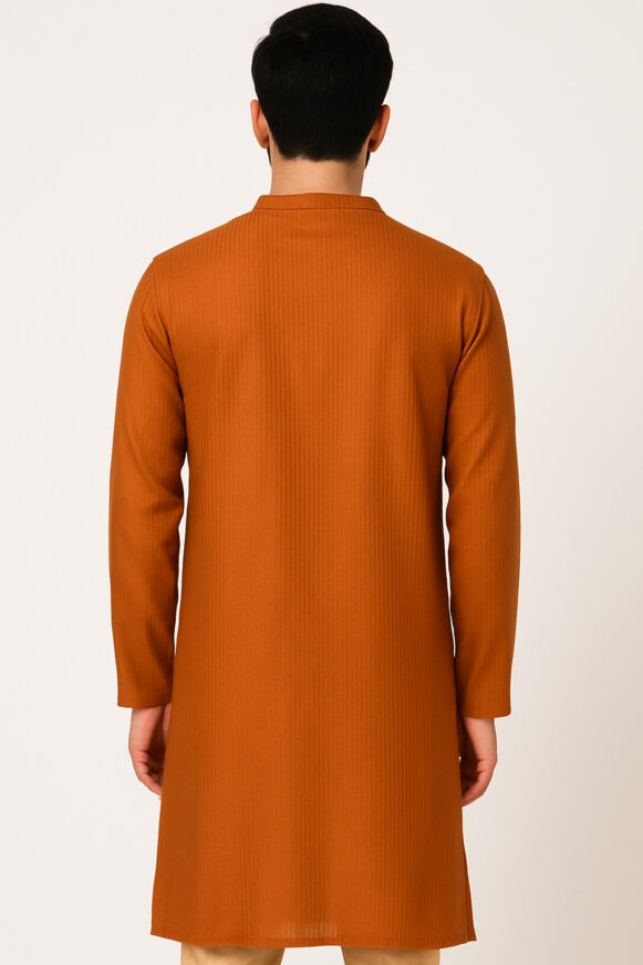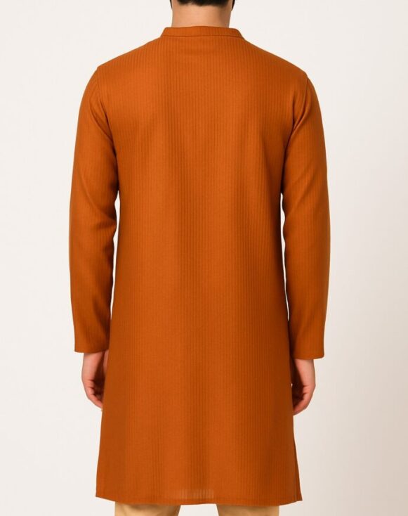 Burnt Orange Cotton Kurta, Men’s burnt orange textured cotton kurta with a mandarin collar, V-notch neckline, and full sleeves for traditional elegance and comfort.
