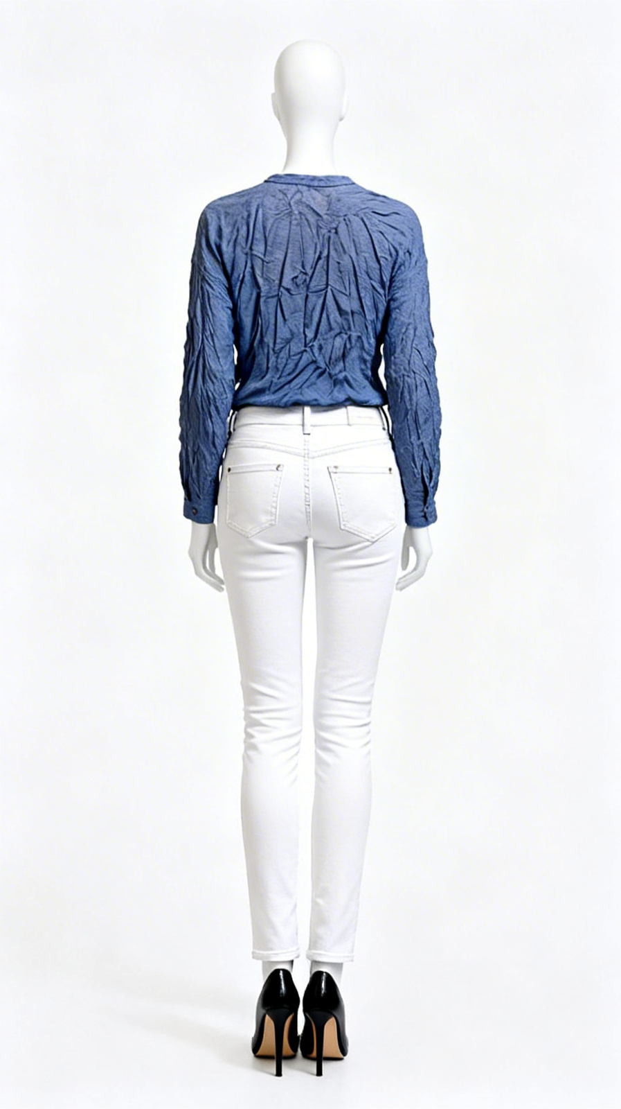 A relaxed blue cotton shirt with 3/4 sleeves, front buttons, and a high-low hemline
