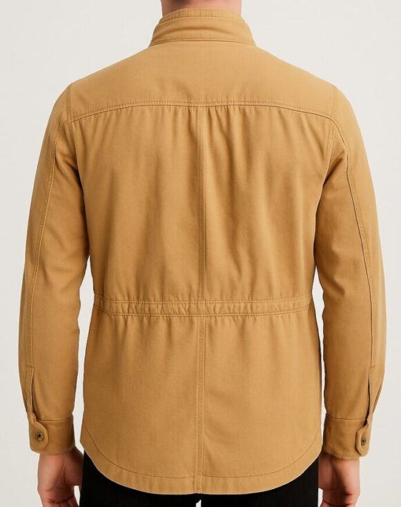 Men’s camel brown cotton utility jacket with stand collar, button closure, and four front flap pockets. Comfortable fit with back elastic detail.
