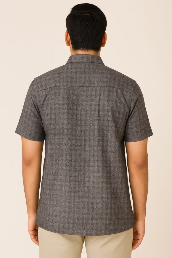 Upgrade your semi-formal wardrobe with this charcoal grey short-sleeve shirt, tailored from a premium fabric featuring a fine checkered weave. The shirt is styled with a classic spread collar, full front button placket, and a neatly stitched chest pocket. With its structured finish and subtle pattern, this piece blends smart appeal with casual comfort—ideal for both office and evening wear.