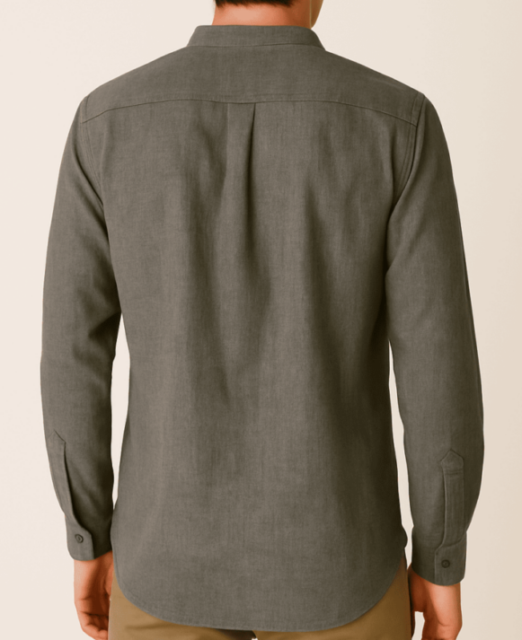 This charcoal gray mandarin collar shirt is tailored from a premium cotton-linen blend that offers both comfort and breathability. Featuring a modern band collar, wooden button placket, and long sleeves with clean cuffs, it's designed for versatility—ideal for both smart casual occasions and daily wear. The shirt's relaxed fit ensures all-day ease, while the central back pleat provides subtle structure and mobility.