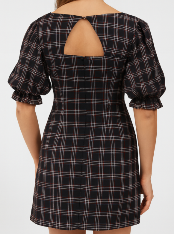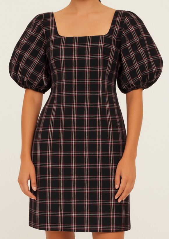 This stylish black mini dress features an elegant red and white checkered pattern, designed with dramatic puff sleeves and a flattering square neckline. Tailored to enhance the silhouette, it includes a fitted waist, back keyhole cut-out, and short hemline, making it a chic choice for day-to-night transitions. Crafted in a soft, breathable fabric, this dress offers both comfort and statement style.