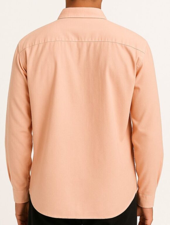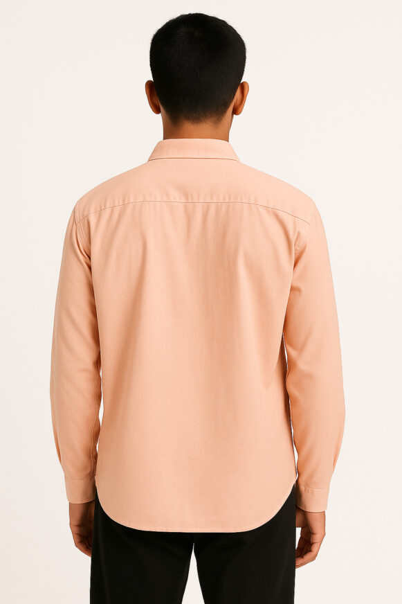 Classic Peach Shirt, Elevate your everyday look with this men’s classic long-sleeve shirt in a soft peach-pink hue. Crafted from breathable cotton, it features a traditional point collar, a front button placket with matching buttons, and a single chest pocket for a clean, minimalist touch. The shirt offers a tailored yet relaxed fit with full sleeves and a curved hem, making it ideal for both casual and semi-formal settings. The solid back panel with a shoulder seam ensures a clean silhouette from behind.