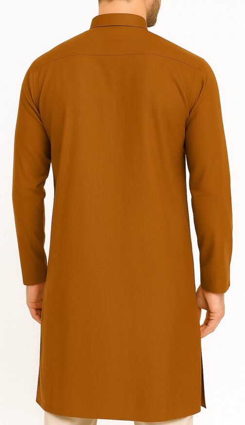 Classic Rust Long Kurta with Mandarin Collar, This classic men's long kurta features a rich rust color and is crafted from a smooth, breathable fabric with a lightly structured texture. The design includes a refined mandarin collar, a half placket with four contrasting buttons, and long straight sleeves without cuff buttons, giving it a clean, traditional look. The straight hem and side slits enhance comfort and ease of movement, making it ideal for festive, formal, or semi-casual occasions. The back has a simple, seamless design for a minimalist finish.