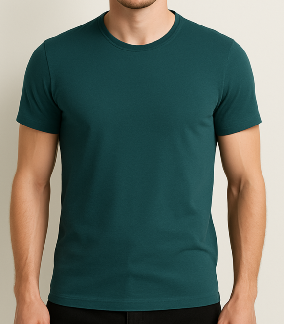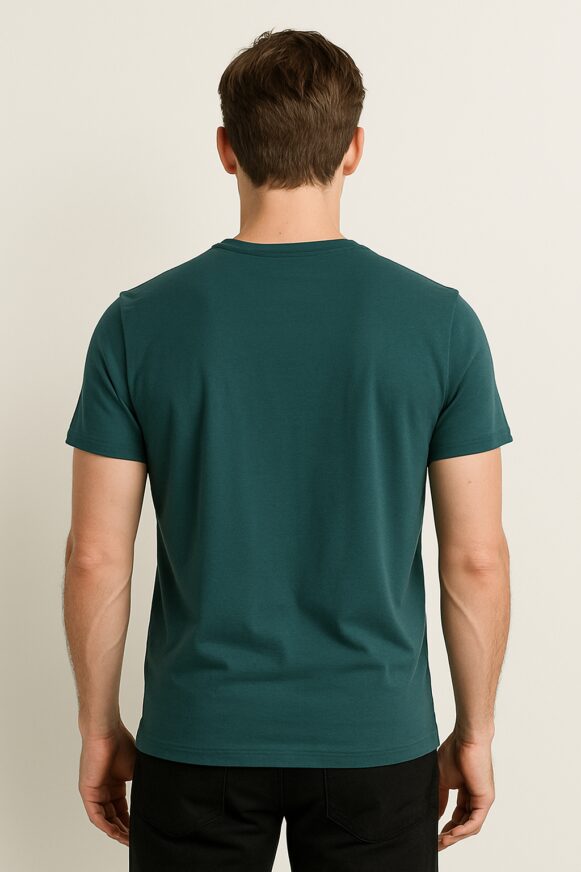 This classic men’s crew neck t-shirt is crafted from soft, breathable cotton in a rich teal green shade. Designed with a flattering fitted silhouette, it features short sleeves, a clean neckline, and a straight hem. Ideal for casual everyday wear or layering, this essential wardrobe piece offers both comfort and style.