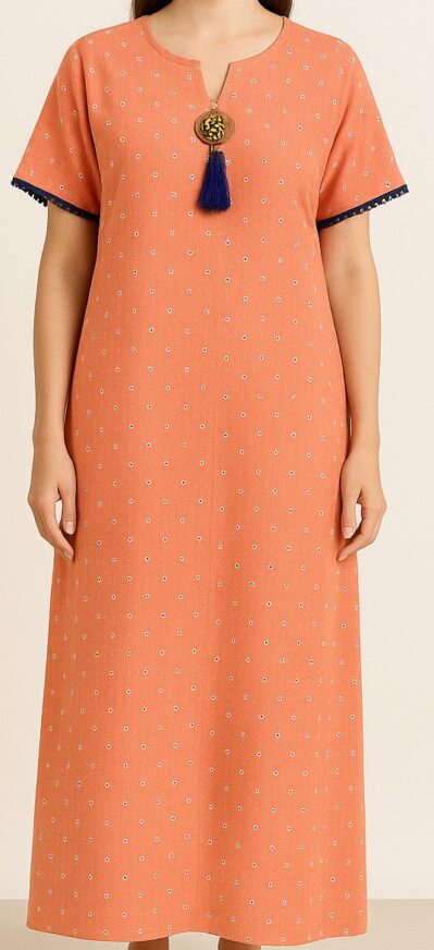 Step into effortless style and comfort with this full-length kaftan-style dress crafted from breathable cotton fabric in a muted coral-orange hue. Adorned with delicate white floral dot prints throughout, the dress features a round neckline with a short V-slit. A standout wooden brooch with a navy-blue tassel adds an elegant focal point at the neck. The sleeves are trimmed with navy scalloped lace, enhancing the overall charm. Designed in a relaxed, loose silhouette with a straight hem, this dress is ideal for lounging or casual daywear.