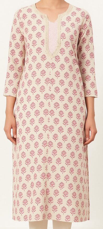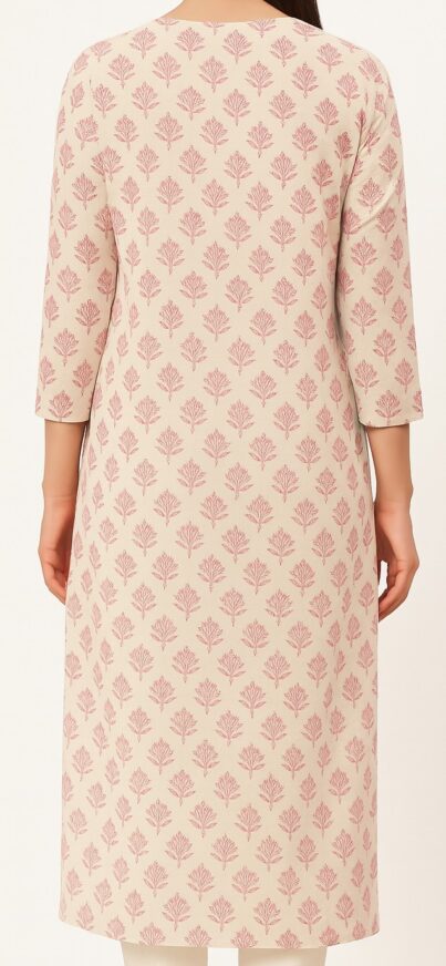Cream Floral Kurta, This elegant cream-colored kurta is adorned with a subtle pink floral handblock print throughout. Crafted from soft and breathable cotton, it features a straight silhouette with side slits for comfort and style. The neckline is detailed with a rounded V-slit enhanced by intricate beige crochet lace and a pastel pink printed patch on the yoke, adding a delicate and feminine touch. The 3/4th sleeves and knee-length finish make it perfect for casual daywear or office attire. The back side features an all-over printed design with a clean, seamless finish.