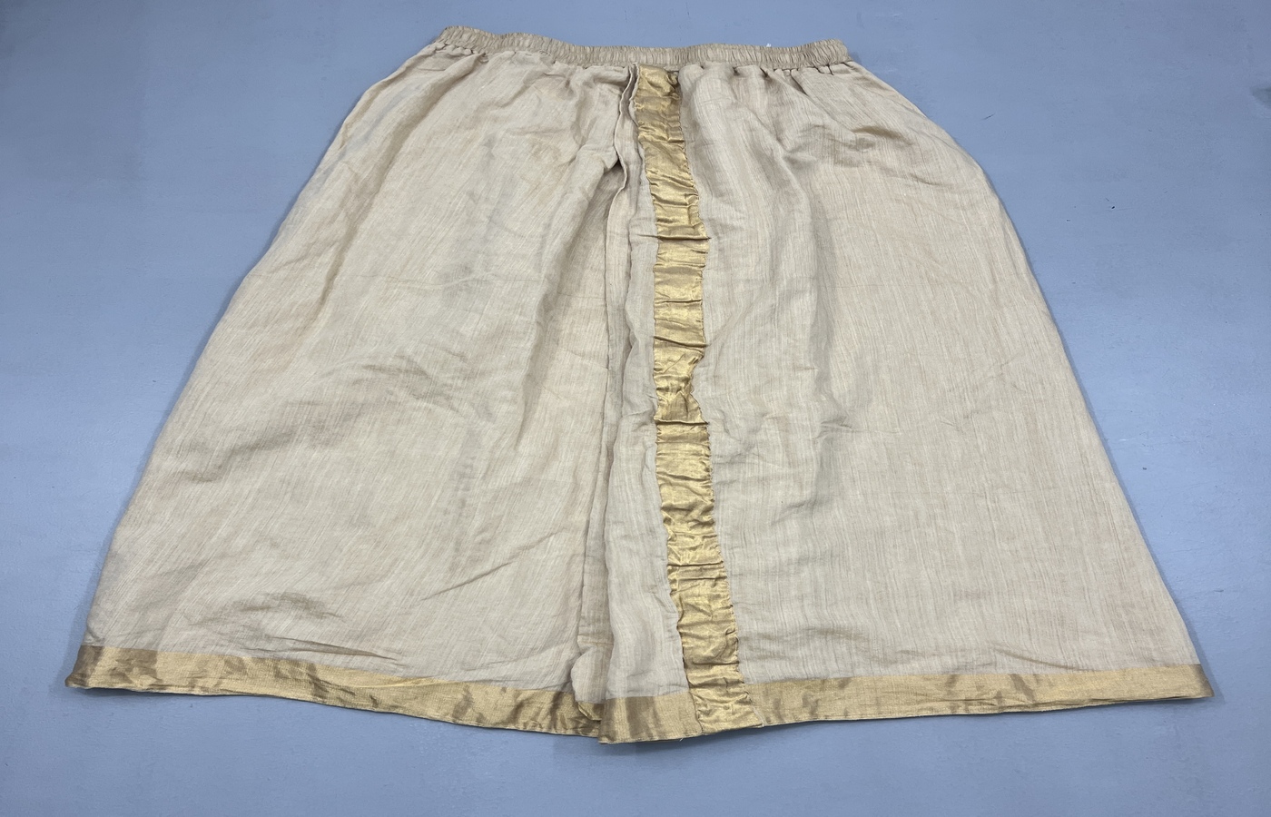Cream Silk Lehenga Cream Silk Lehenga is designed with a full-length flare and subtle gold hem accents that elevate its traditional character. Crafted from silk, it ensures breathable comfort and fluid movement. The elasticated waist enhances practicality while maintaining elegance. Ideal for formal celebrations, this piece blends timeless craftsmanship with modern wearability, delivering consistent structure and polished camera-ready presentation.