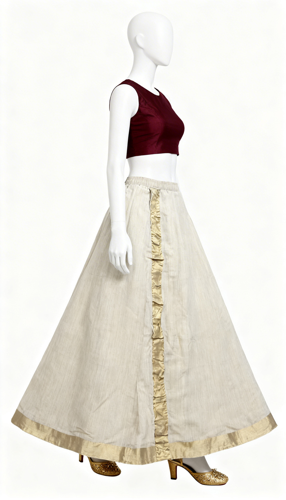 Cream Silk Lehenga Cream Silk Lehenga offers classic flare with gold hem detailing and smooth structured festive drape.