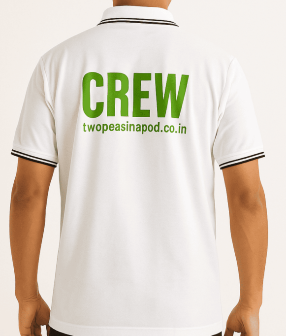 Step into professional comfort with this premium white piqué polo T-shirt, tailored for crew members and production teams. The back proudly features a bold green “CREW” print and the website "twopeasinapod.co.in" for instant recognition. Designed with a classic collar and black contrast tipping on sleeves and collar, this polo combines minimal aesthetics with team spirit. Perfect for long workdays and media shoots.