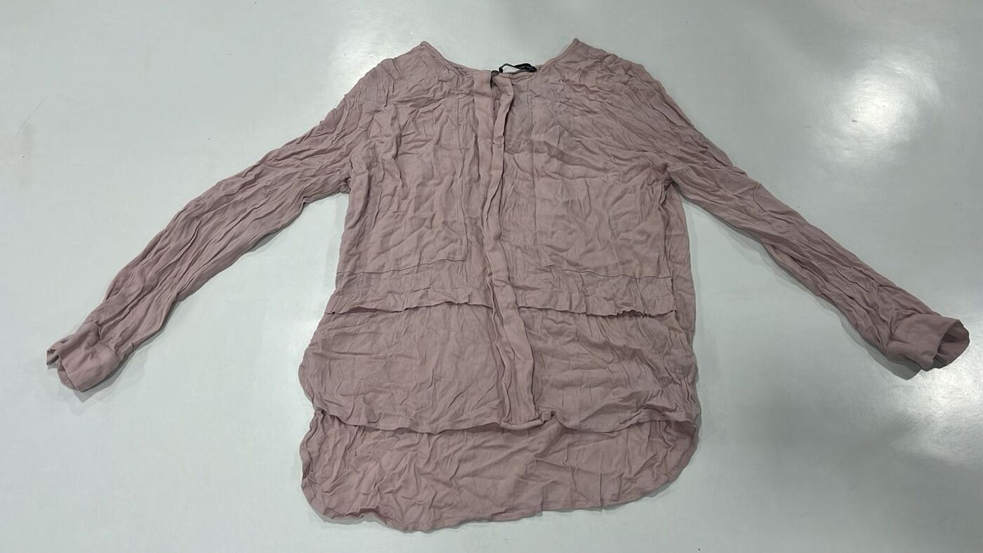A relaxed-fit pink chiffon top with crinkled texture and a high-low hem