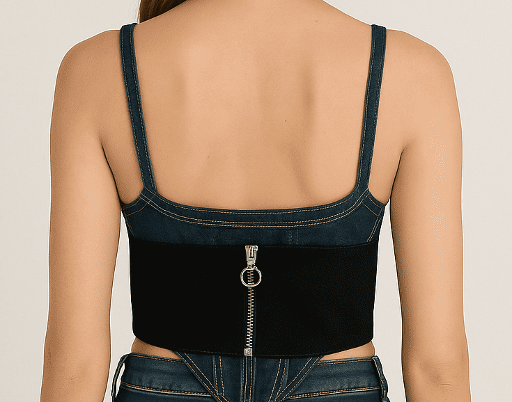 Dark blue denim corset crop top with black side panels, scoop neckline, and back zipper—perfect for a bold and trendy look.