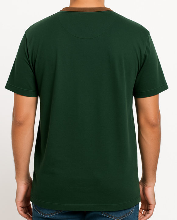 Elevate your casual wardrobe with this men’s dark green Henley T-shirt featuring a contrasting brown round neck collar. Designed with a three-button placket, short sleeves, and a comfortable regular fit, this T-shirt blends minimalism with a touch of detail. Made from breathable cotton-blend fabric, it ensures all-day comfort and style, perfect for everyday wear, casual outings, or layering under jackets.