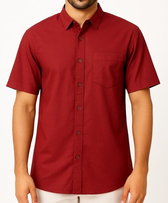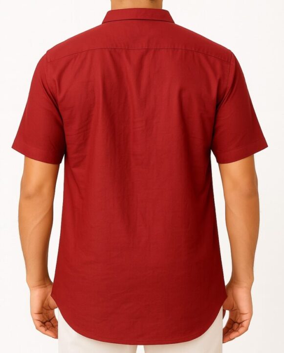 This men's short sleeve shirt in a rich deep maroon color offers a crisp and polished look for casual or semi-formal occasions. Made from breathable cotton fabric, the shirt features a classic pointed collar, front button-down placket with matching maroon buttons, and a single left chest pocket. The back panel is plain, showcasing a clean finish with a slightly rounded hem for comfortable wear. Designed for regular fit, this shirt is both stylish and versatile.