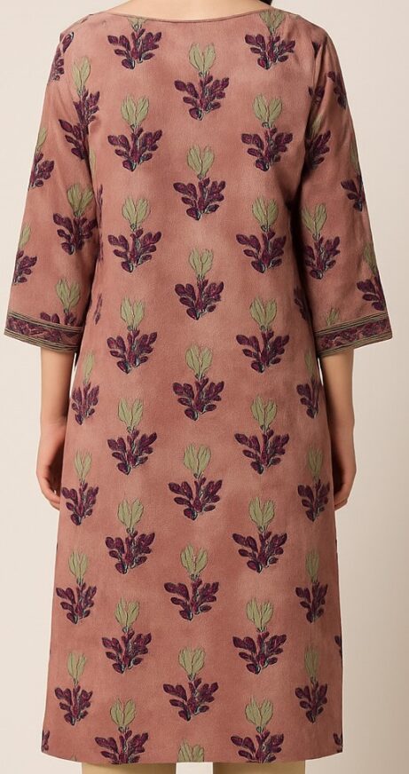 Dusty Rose Floral Print Kurta, Dusty rose cotton kurta with Mughal floral print, embroidered neck, and 3/4th sleeves.