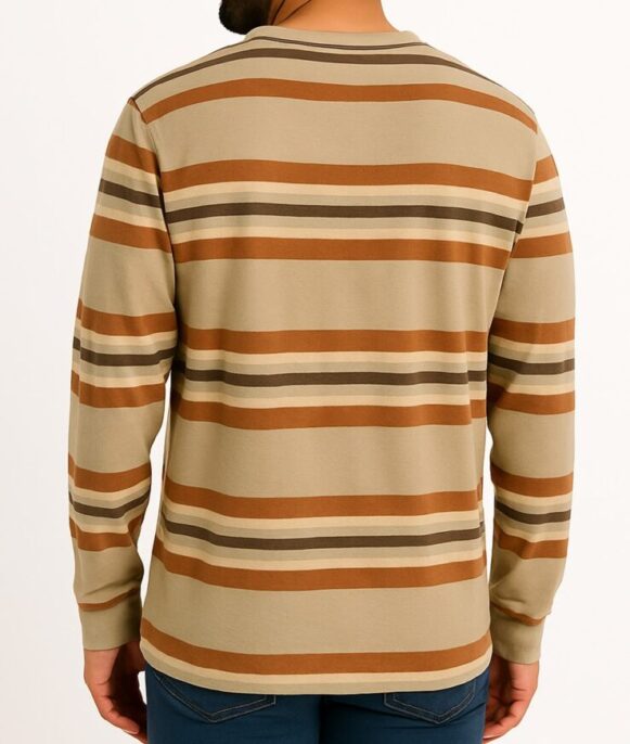 Earth Stripe Long Sleeve T-Shirt, Step up your everyday style with this men’s full-sleeve t-shirt featuring multicolor horizontal stripes in warm earthy tones like sand, camel, and coffee brown. Crafted from soft, breathable cotton-blend fabric, the tee offers a comfortable regular fit with a classic crew neck. Designed for both casual outings and layered streetwear looks, this t-shirt blends timeless color tones with a modern fit.