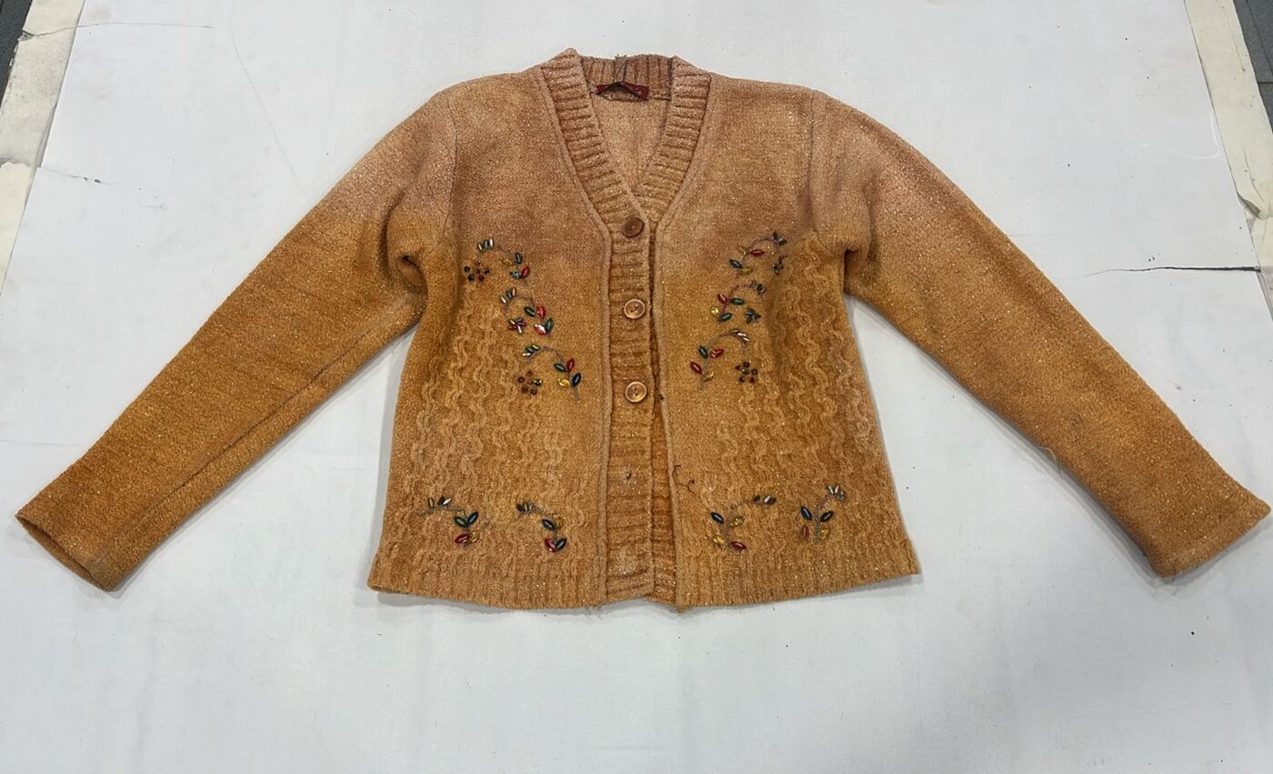 Knit cardigan with decorative embellishments and front button closure for winter styling