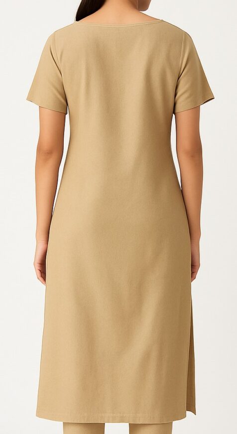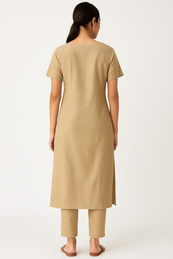 A stylish beige straight kurta crafted from soft cotton fabric, featuring delicate tonal embroidery across the neckline, sleeves, and diagonal front panels. The square neckline adds a modern touch, while the short sleeves and side slits ensure comfort. Perfect for everyday wear or casual outings, this kurta pairs well with matching trousers or contrast leggings for an elegant look.