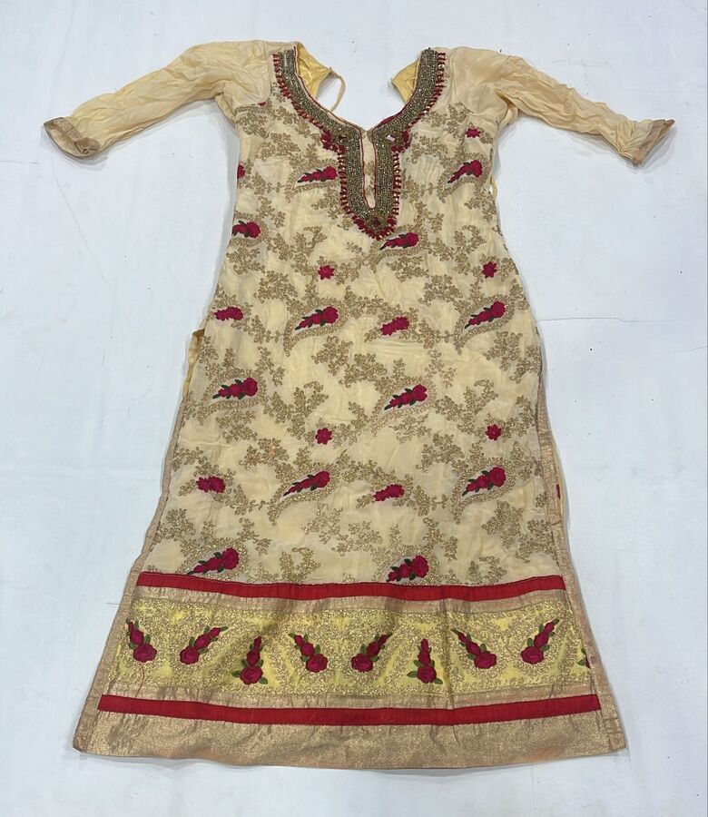 Heavily embroidered kurti with ornate neckline and decorative hem border ideal for festive and wedding wear