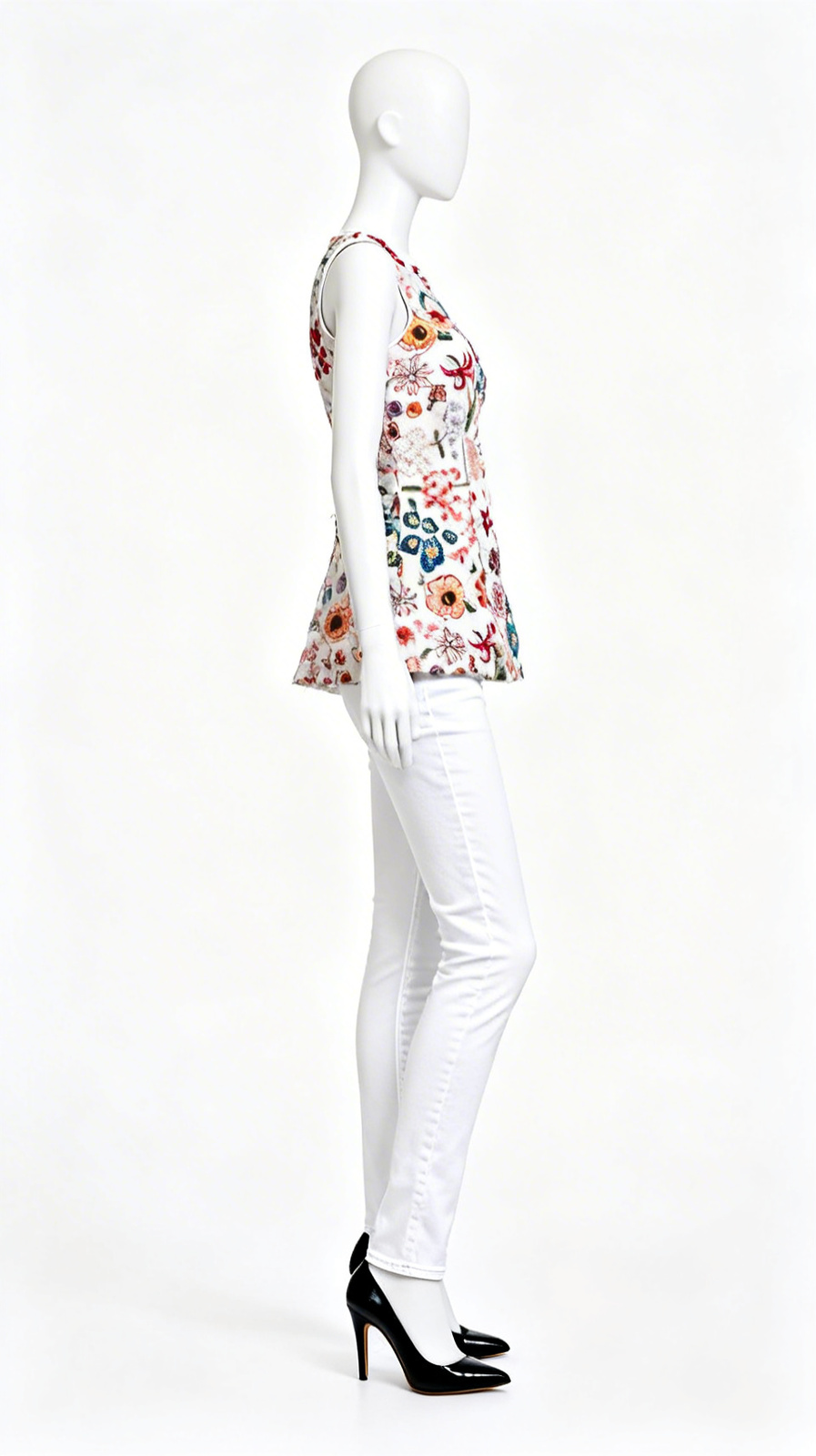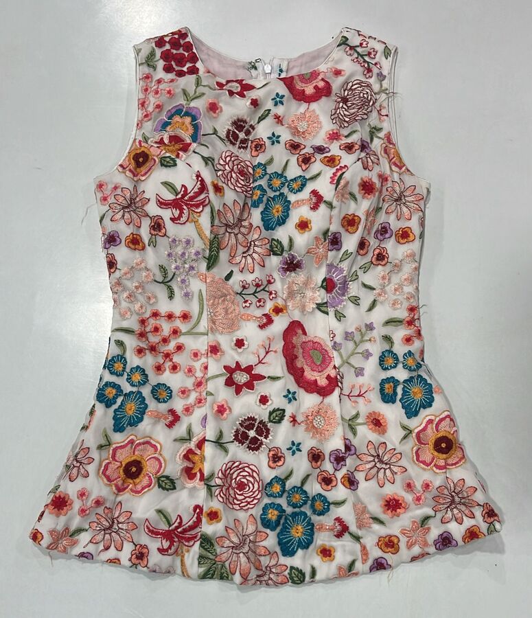 A richly embroidered sleeveless top with vibrant threadwork and fitted silhouette