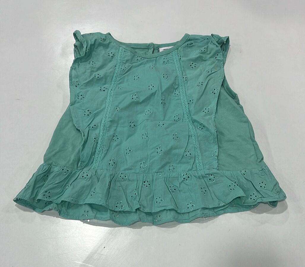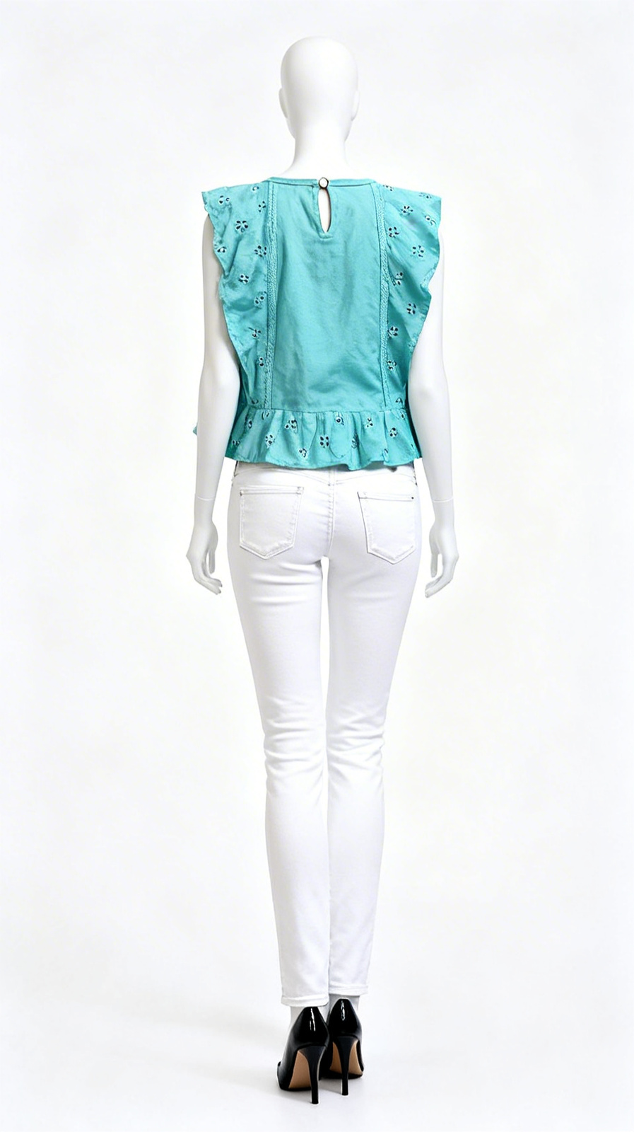 A breezy green cotton sleeveless top featuring eyelet embroidery and a ruffled hem