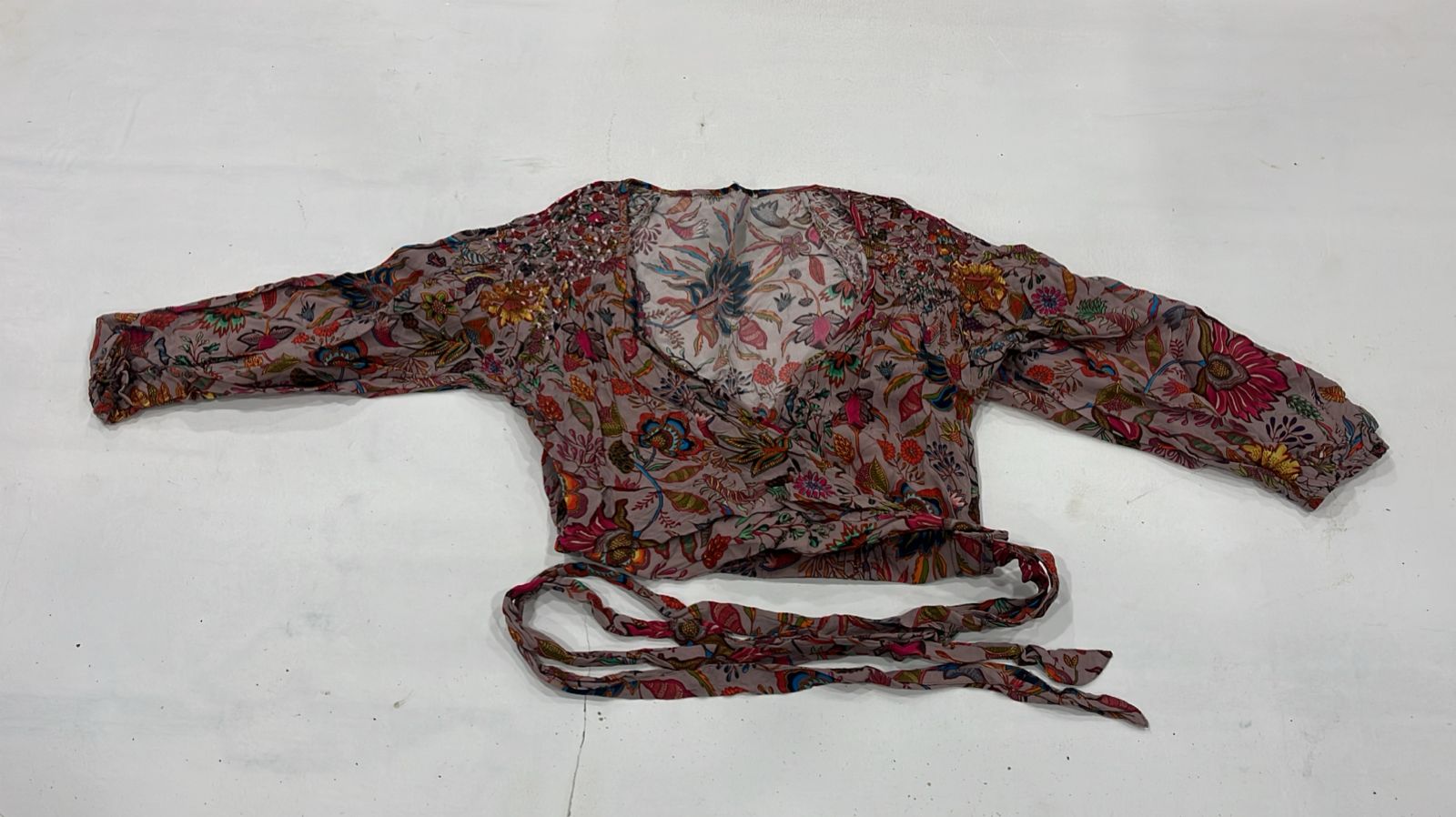 A lightweight sheer wrap top with vibrant floral prints and long gathered sleeves